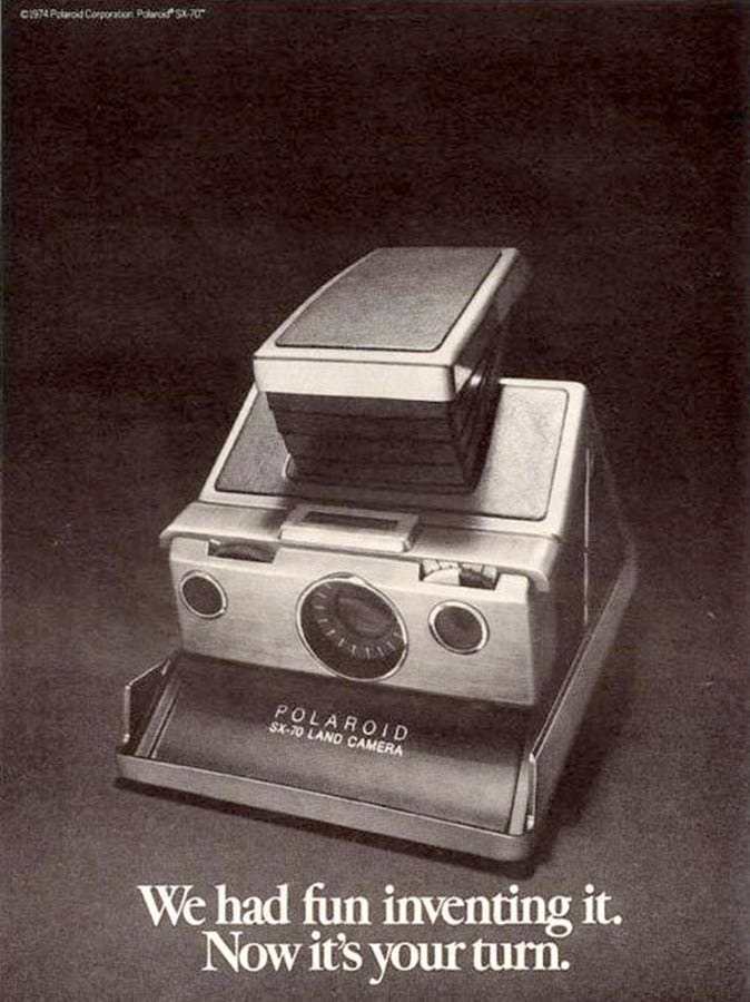 - 1972: llega la cámara Polaroid SX-70. Las primeras instantáneas en color de autodesarrolladas, una SLR totalmente automática, motorizada y plegable.