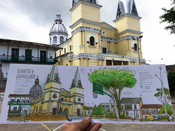 Adicional a los dibujos de los sábados con los Urban Sketchers, Nel se propuso recorrer Antioquia y así fue dibujando cada uno de sus municipios (aún le faltan más de la mitad) cada uno de ellos retratados con el entrenamiento y la disciplina de practicar constante: