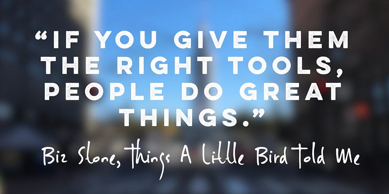 Biz Stone en su libro «Things a Little Bird Told Me» cuenta como el éxito a la noche a la mañana de Twitter fue un proceso, y como uno debe crearse sus propias oportunidades, ponerle amor a lo que se hace y brindar las herramientas para que los demás sigan creando.