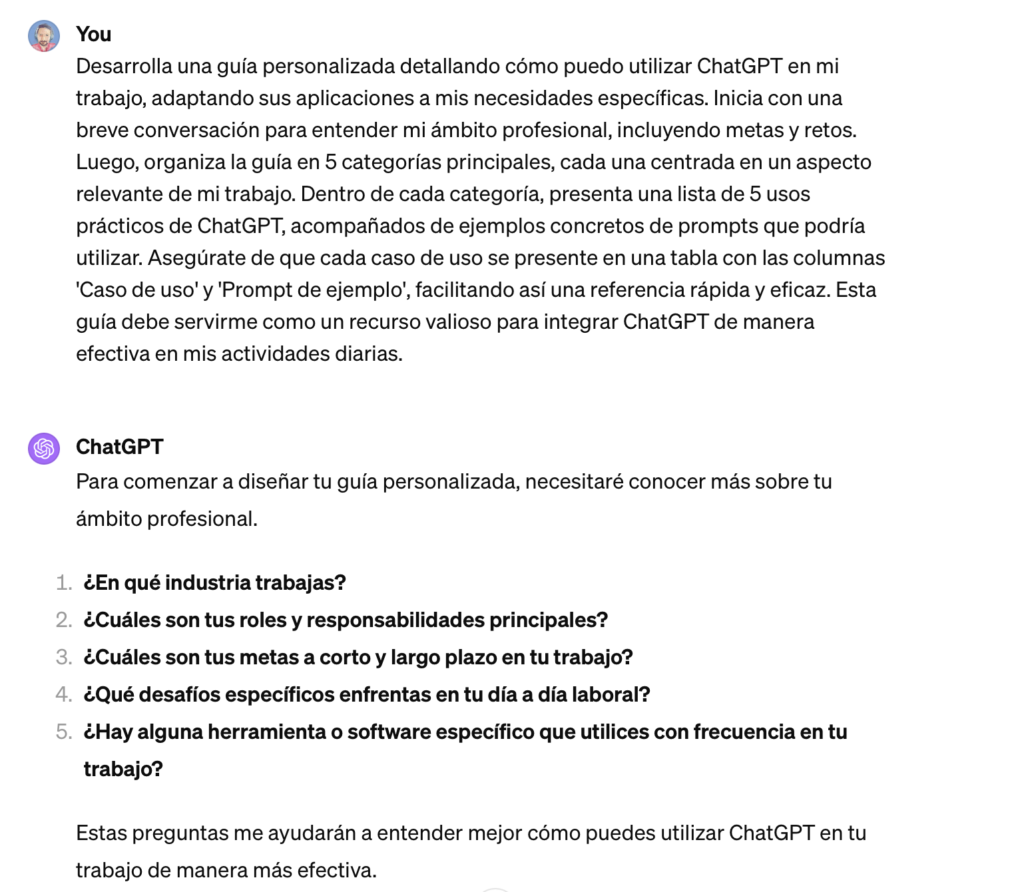 - Introducción y objetivo claro: “Desarrolla una guía personalizada detallando cómo puedo utilizar ChatGPT en mi trabajo, adaptando sus aplicaciones a mis necesidades específicas.”