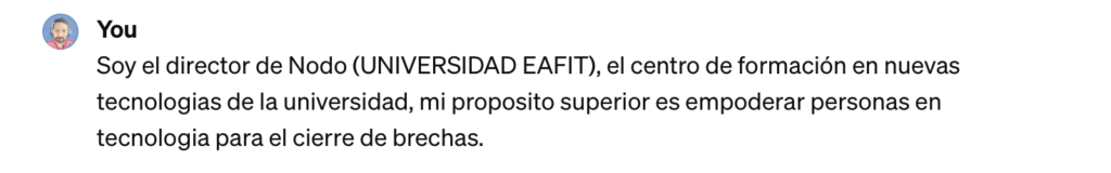 Luego, empiezo por contarle a ChatGPT sobre mi trabajo y lo que estoy tratando de lograr. Acá es importante anotar, que se puede ser tan descriptivo como se quiera, y cuanto más descriptivo sea, mucho mejor contexto tendrá para trabajar.