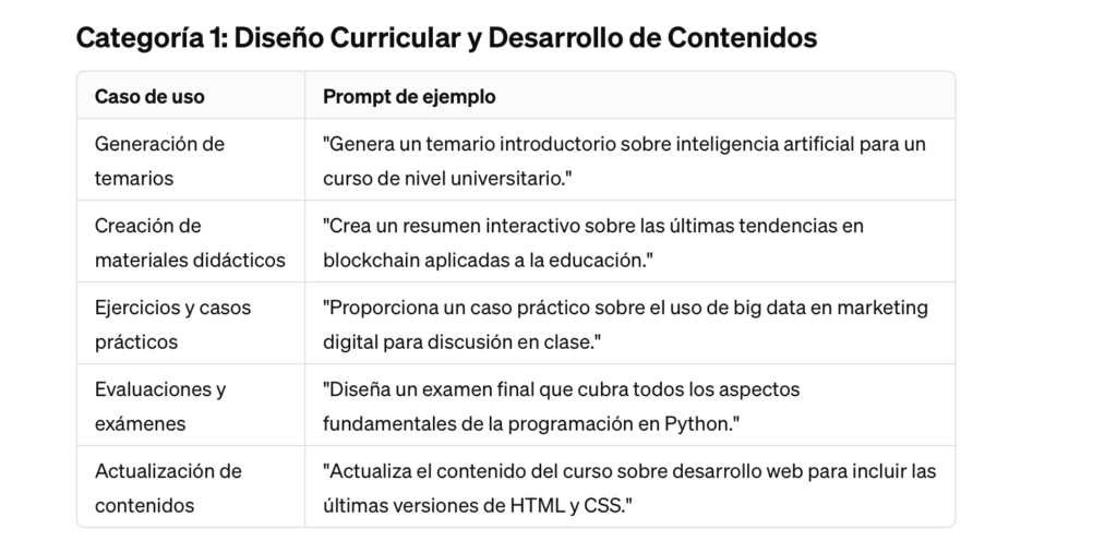 - Formato específico para facilitar la referencia: “Asegúrate de que cada caso de uso se presente en una tabla con las columnas ‘Caso de uso’ y ‘Prompt de ejemplo’, facilitando así una referencia rápida y eficaz.”