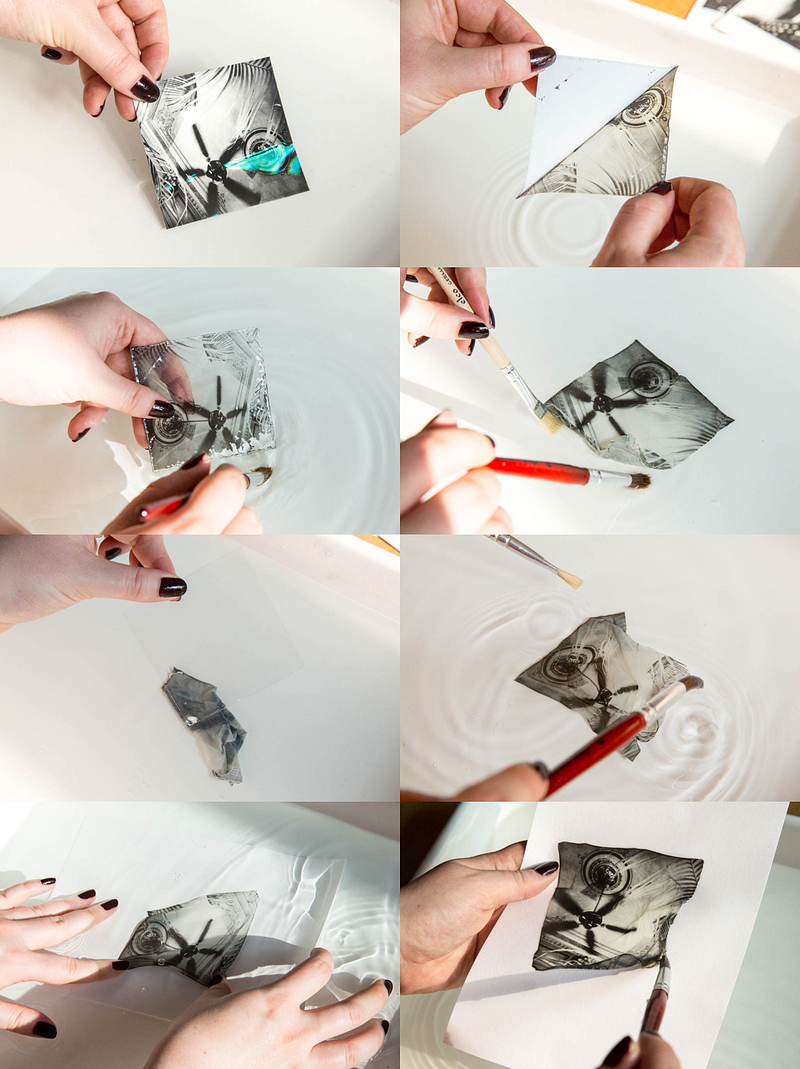 Una de estas es el “Emulsion Lift”, una técnica clásica en la que la película se despega, luego el panel frontal transparente se sumerge en agua tibia para liberar la capa de emulsión del plástico. Finalmente, estas emulsiones pueden colocarse en varios papeles u otros materiales.