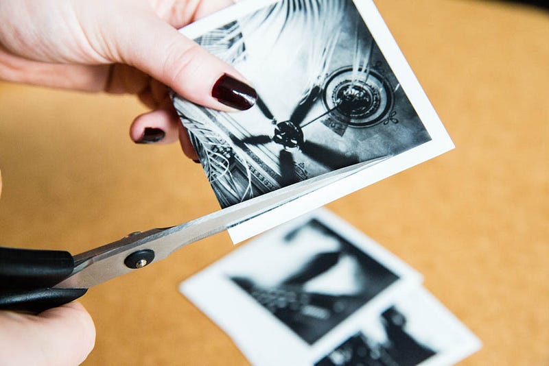 - Usando las tijeras, cortar el marco de tu imagen por todos los lados. Solo conservar la foto cuadrada.